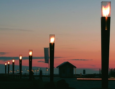 The torch giants, which are over three metres high proudly illuminate the promenade. A chain of lights, which not only invites tourists to stroll along the promenade. Robust steel joins glass.